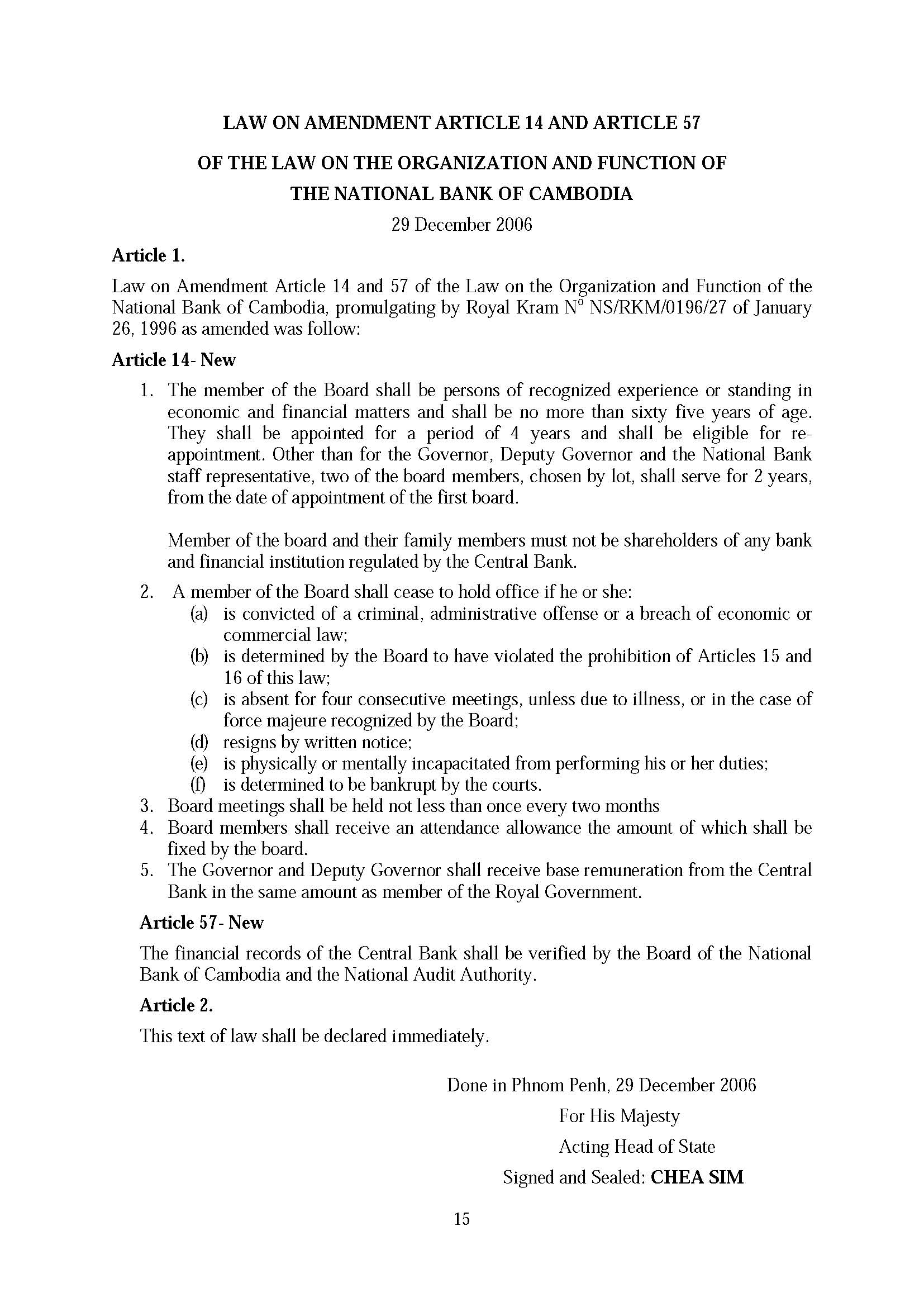 Law on the Amendent Article 14 and Article 57 of the Law on the Organization and Function of the National Bank of Cambodia(2006)